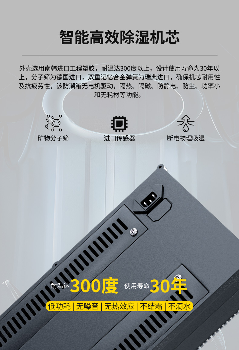 控濕機(jī)芯:外殼選用南韓工程塑膠,耐溫達(dá)300度以上,設(shè)計使用壽命為30年以上,分子篩為德國進(jìn)口,雙重記憶合金彈簧為瑞典進(jìn)口,確保機(jī)芯耐用性及抗疲勞性; 該防潮箱無電機(jī)驅(qū)動,隔熱﹑隔磁﹑防靜電﹑防塵﹑防盜﹑功率小和無耗材等功能,因此,該防潮箱具有環(huán)保﹑節(jié)能﹑靜音﹑無污染、不滴水。